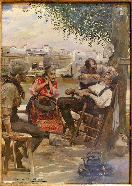 Efectivamente, en la última década de la centuria decimonónica, se dieron las circunstancias favorables para esta posición en la cúspide de la Escuela sevillana de pintura al coincidir cronológicamente con la época otoñal de Eduardo Cano de la Peña, su propio maestro académico, ya que la persona que lo inspiraría en lo formal, sería Jiménez Aranda. Cano fue el artista que personificó la oficialidad hispalense en grado sumo durante los veinte años anteriores, que corresponden, efectivamente, con la etapa en la que García Ramos se formó y después probó suerte con la pintura de casacón en Roma (1872-1875, 1877-1880), París (1881) y otros lugares de España, casi siempre siguiendo a Jiménez Aranda. Cuando García Ramos se estableció en Sevilla al declinar el siglo, su consagración artística vino como consecuencia de la alternativa que planteó con la práctica de la pintura costumbrista, una tipología que deshabilitaba en el escenario cotidiano de la ciudad del Guadalquivir las dos grandes tendencias internacionales propias de las décadas anteriores: la pintura de Historia de Eduardo Cano y la de casacón de Jiménez Aranda, renombrada recientemente esta última como pintura neorrococó[9]. La invitación de García Ramos era un nuevo costumbrismo, alejado del romántico y murillista que, entre 1830 y 1870, aproximadamente, desplegaron los Domínguez Bécquer, los Cabral Bejarano o los Hispaletos. El suyo era, por contra, un costumbrismo realista, que no reproducía la imagen de la Sevilla creada por los viajeros foráneos –y que solo existía en su literatura de viajes y en la pintura que encargaban ex profeso–, sino la cotidiana y real que, con gracia popular, aun se daba con frecuencia y naturalidad en determinados enclaves urbanos.